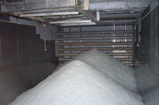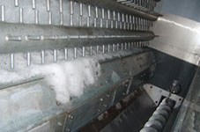 弗格森研发的履带式自动储冰库是为了解决“强固结冰层”的问题。冰库底部全体形成履带式输送带,可整体向前方移动,把冰输送到出口处的螺旋输送部分。这样就不存在下部的冰在库内长期停留的问题,也就不会发生强固冻结。此外履带式储冰库的出冰是连续性的,再配置上自动计量器,可以非常准确地调控供冰量。
